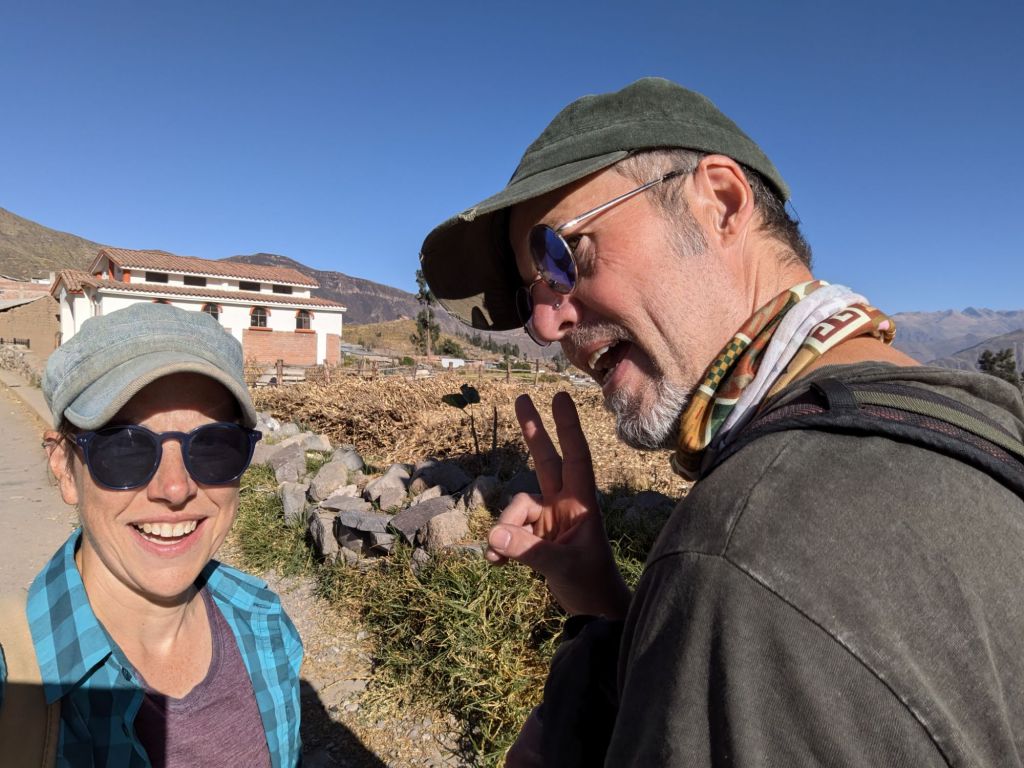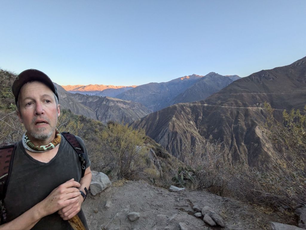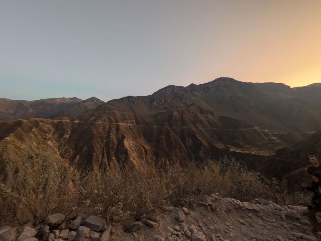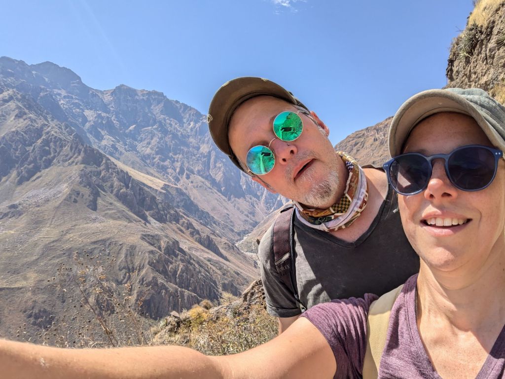 So at 3am (uurgh!) we were picked up from our hostel for a 3 hour drive to the canyon edge and the start of our hike. Before starting, we stopped for a traditional breakfast of, by now, the fairly standard eggs, bread, butter and jam we’ve come to expect, but this time served with Chicha, a corn based drink, which we hadn’t tried to date. I quite enjoyed it, but I don’t think Richard was enamoured with the hot, lumpy concoction! One thing we also got ‘treated’ to which we weren’t expecting, was two Peruvians all dressed up in traditional clobber, who proceeded to put on some traditional music and started dancing! Did I mention it was only 6.45am?!