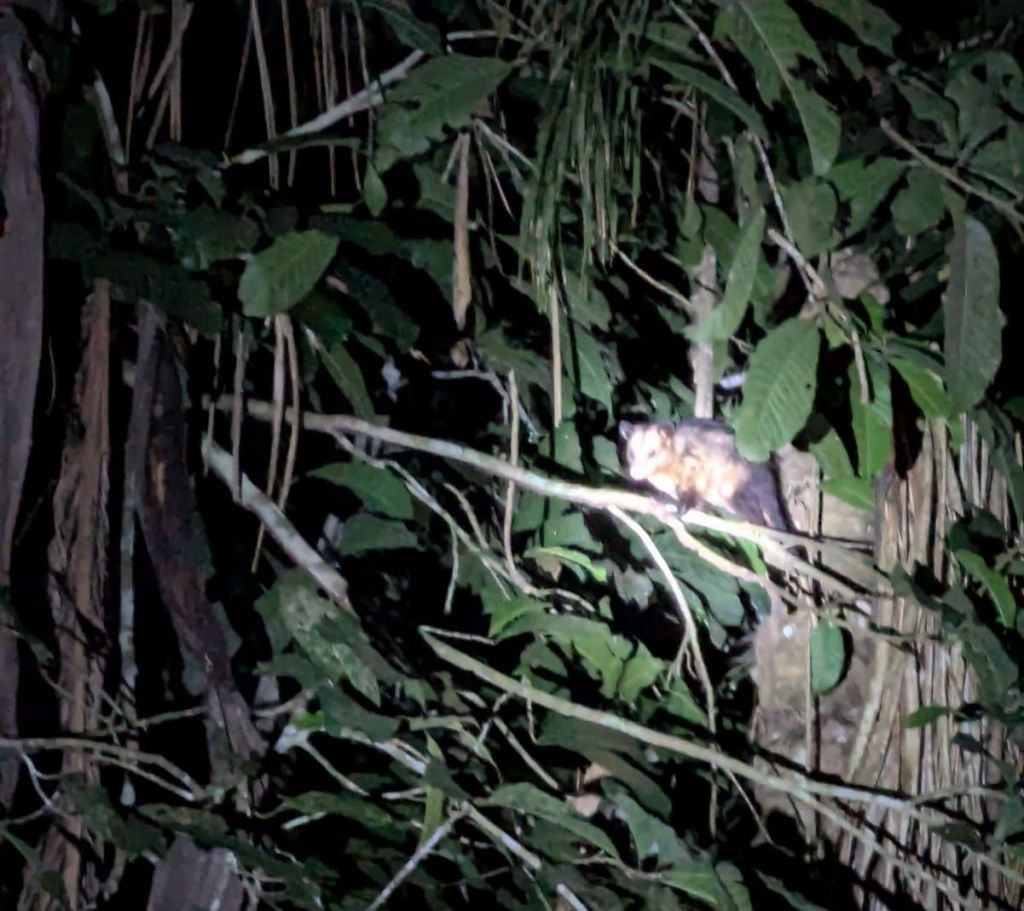 Something I had been looking forward to was the possibility of a night walk, so after a dinner back at the lodge, consisting of some other food, Nilo, Rebecca and I braved the night to go ‘a hunting’ in the forest.