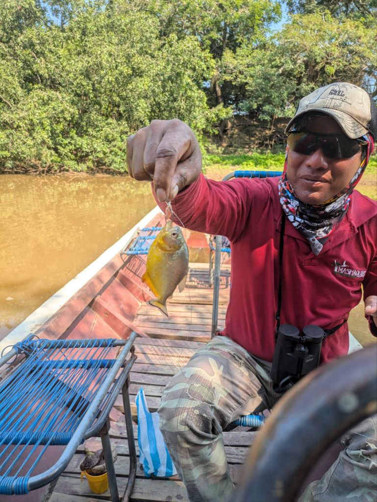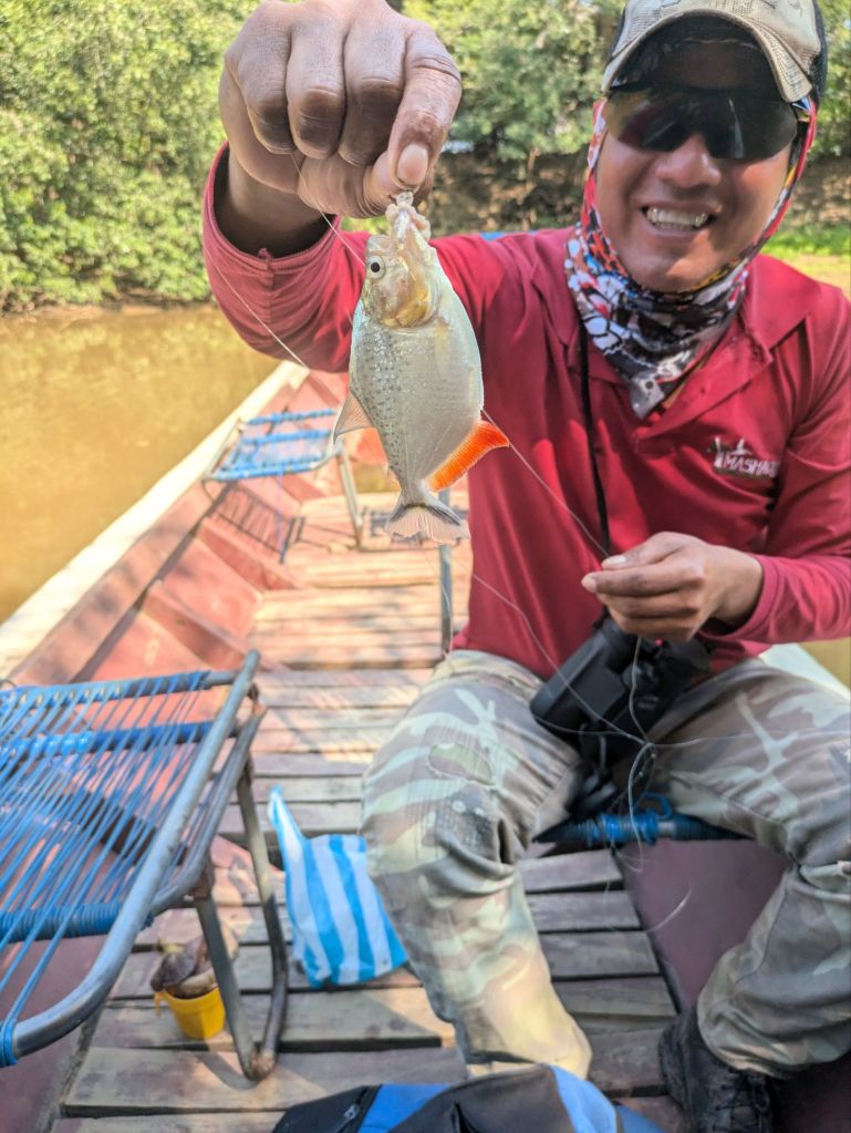 The final morning saw us take another river trip, including an opportunity to try to catch some piranha. Neither of us are particular fans of fishing (as we don’t imagine it’s especially enjoyable for the fish), but since we reckoned our chances of actually catching anything were pretty low, we thought we’d have a go! Needless to say our prediction was right and we caught sod all! At least the piranhas got a nice lunch, having felt stripped all the meat we used as bait was cleanly from the fishing hooks multiple times! Our guide (a native of the area and a dab hand at fishing this way having done it all his life) did, however, catch a couple to show us very quickly, before setting them free.
