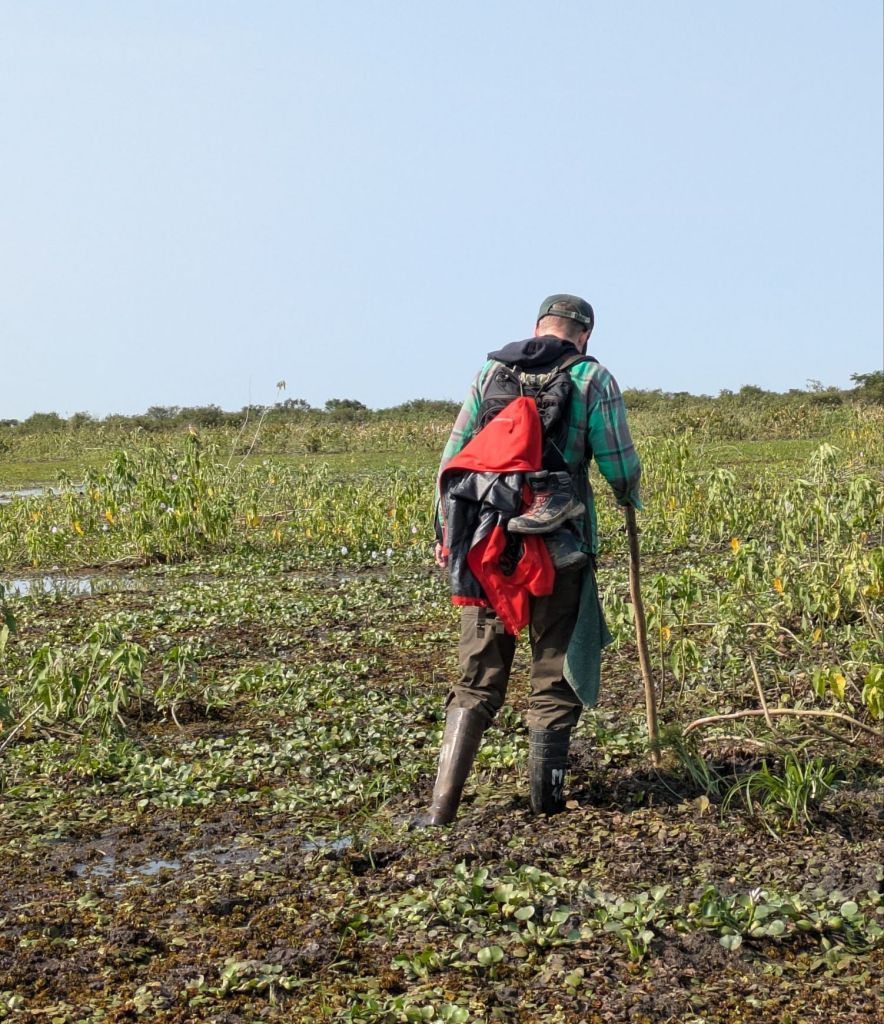 After an hour or more of searching, we’d not found any anacondas ourselves, although we had watched two giant storks find and gobble down two relatively small and unlucky snakes! What I did manage to come across though, was an angry wasp (or at least that’s what we deduce it was), that promptly stung me on the nose, causing me to flail about and throw my sunglasses into the swamp! Thankfully Richard saw where they landed and I managed to retrieve them before they sank. And so, with that, we decided it was time to head back to the safety of the lodge again!