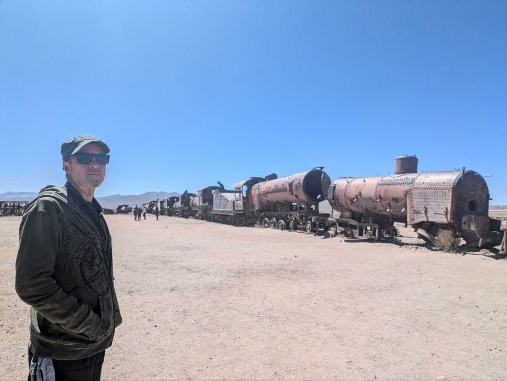 The first stop saw us at a ‘train graveyard’ just outside Uyuni. The defunct trains are scrap from the dwindling mining industry of the area, although we’re not really sure why this has found favour as part of the tour, as the actual site didn’t seem that interesting to us, although I did nevertheless clamber up onto one of the rusted shells of a train and have a photo.