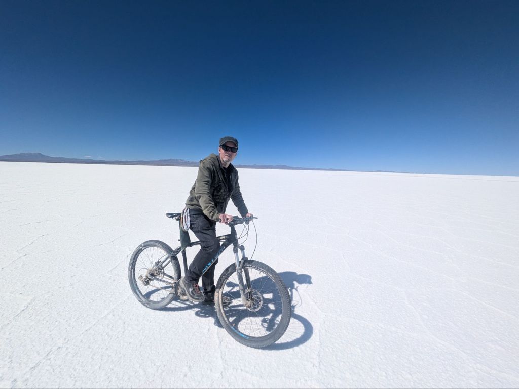 Despite it being called a 3 day salt flats tour, it’s really only Day 1 that’s on the salt flats (although you do pass by a couple of smaller salt flats on the other days), and which we headed to for the afternoon. After driving across the flats for a while we were to change transport for a short time, as our tour was the only only to include a cycle ride on the salt flats. As with everything in Bolivia, our bikes were definitely sub-par, with mine not being able to change gear at all and Richards continually doing so of its own accord! I don’t think the brakes were up to much either but thankfully there are no hills on the salt flats so we could just slowly roll to a stop! Despite the condition of the bikes (admittedly the salt can’t be much good for them!) we still had fun for half hour or so and it’s definitely the strangest place we’ve ever biked!