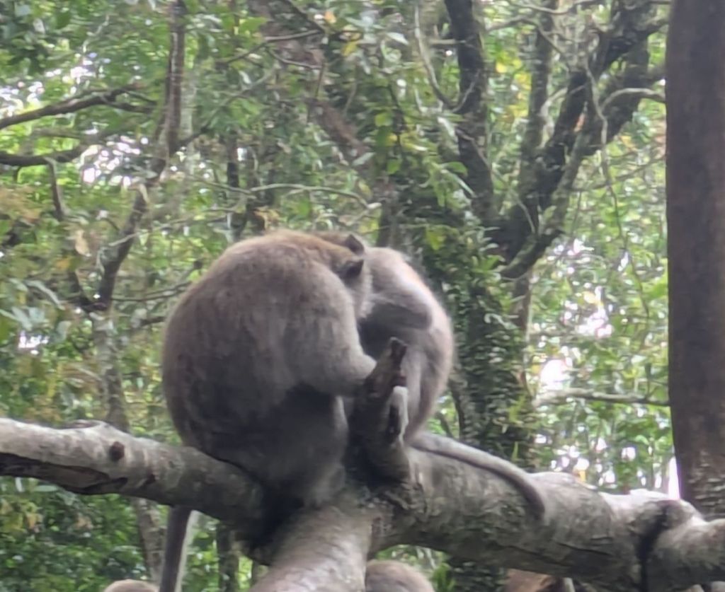 You’ll probably guess that we were headed to the first to try and see some monkeys. Unfortunately, almost the moment we got there it started to spit with rain, making the likelihood of spotting any much slimmer; still we were there so we might as well try! We did spot one grey macaque huddled in a tree, but then the heavens opened and we were left to do our own huddling under our umbrellas! We eventually conceded defeat as the paths turned to rivers and we retreated, sodden, to a local ‘warung’ (a small independent local eatery or shop) for coffee and lunch.